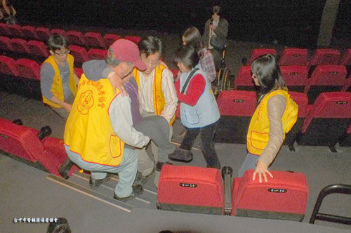 一大早,在復康巴士的 協助下,會員朋友陸續抵達 新光百貨一樓廣場集合,新 光影城特別開了一個電影廰 來服務本會會員,大家分批 乘坐電梯直上13樓新光影城 ,要進入廳內欣賞電影時, 由於廳內座位是階梯式的, 電影廳內可容納輪椅的平台 空間實在有限,勉強將坐電 動輪椅的會員安置好,其他 乘坐一般輪椅的會員,只好 在志工朋友們的協助下,移 動到廳內座位上,光是安排 會員就座,就是一件大工程 。但是每次辦活動,本協會 的志工隊,總有一群熱心的 志工朋友主動來幫忙,再艱 鉅的任務,到了他們手上都 能一一克服,志工朋友們出 了好大的力氣,有的用揹的 ,有的用抬的,在不怎麼寬 敞的空間中,把笨重的會員 一一安置在最佳位置,以便 欣賞電影。