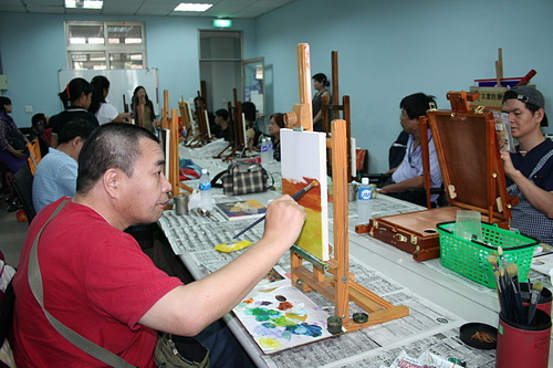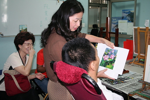 一場車禍造成曾啟雄頸髓損傷,導致四肢癱瘓,手部的細部動作完全喪失,生活起居都須曾爸爸幫忙,曾爸爸一肩扛起家計非常辛苦,沒工作能力的啟雄也想減少曾爸的負擔,在四年前他打開心門勇敢面對現在的自己來到協會學習油畫,當時我剛接下台中市脊髓損傷者協會油畫班,這是第一次教傷友油畫,對我而言也是新的挑戰,了解啟雄他的身體情況後盡我所能的教導他。
